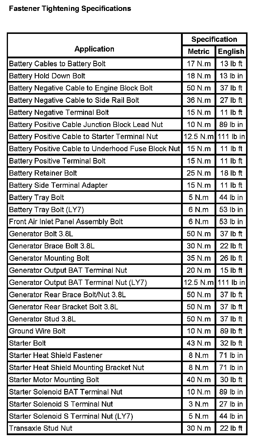 Starting and Charging: Specifications