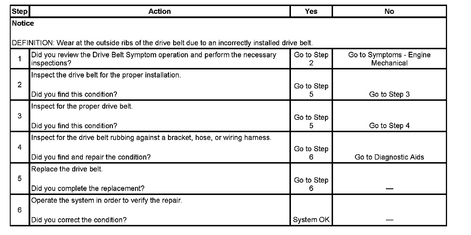 2. The inspection is to verify the drive belt is correctly installed on all of the drive belt pulleys. Wear on the drive belt may be caused by mis-positioning the drive belt by one groove on a pulley.