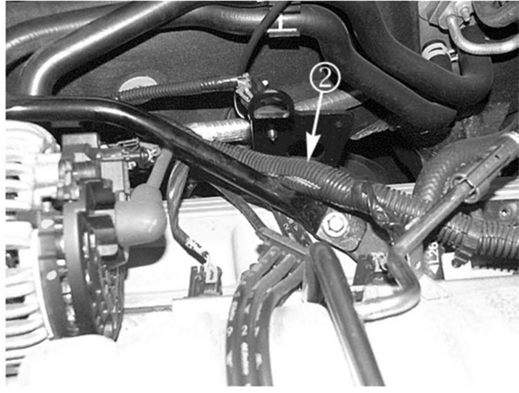 Reinstall the generator rear brace with the PCM harness (2) routed over the brace as shown.