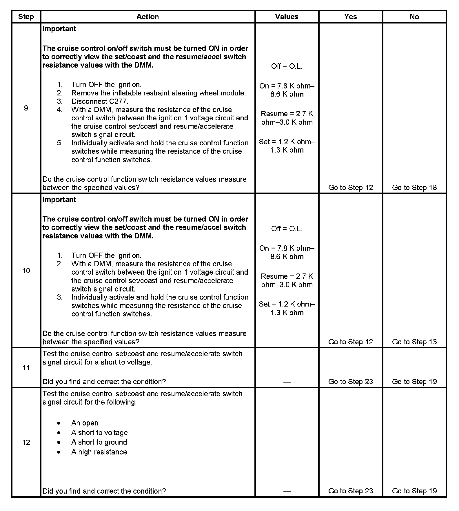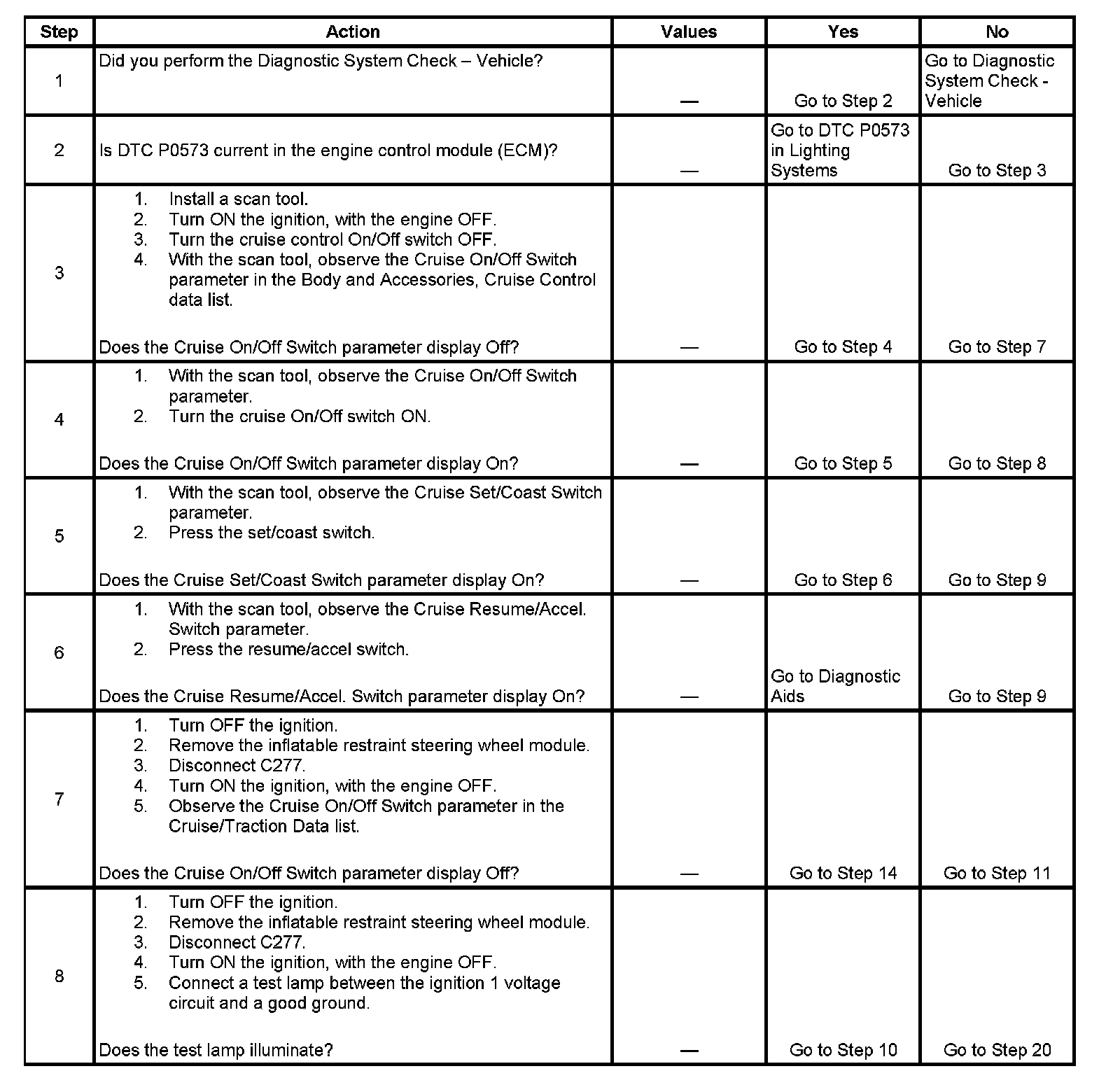 - With a scan tool, observe the cruise control function switch parameters, in the powertrain control module (PCM) cruise control data list, while rotating the steering wheel to both steering stops and individually activating each cruise control function switch separately. This will help eliminate the possibility of an internally shorted inflatable restraint steering wheel module coil.