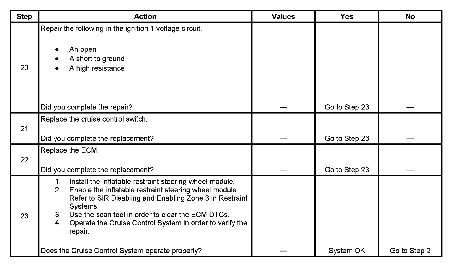 Disable the inflatable restraint steering wheel module when performing this diagnostic table. Refer to SIR Disabling and Enabling Zone 3 in Restraint Systems.