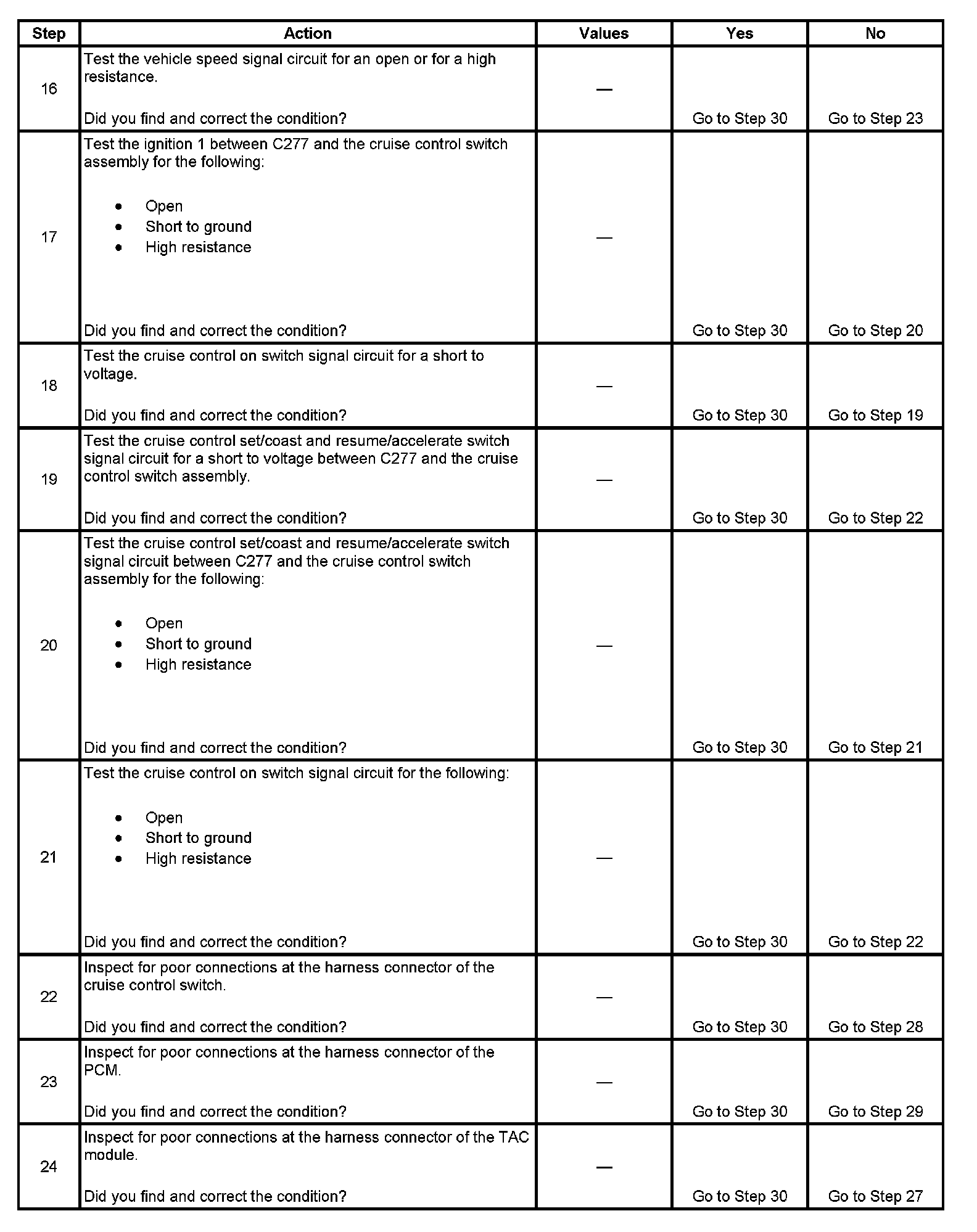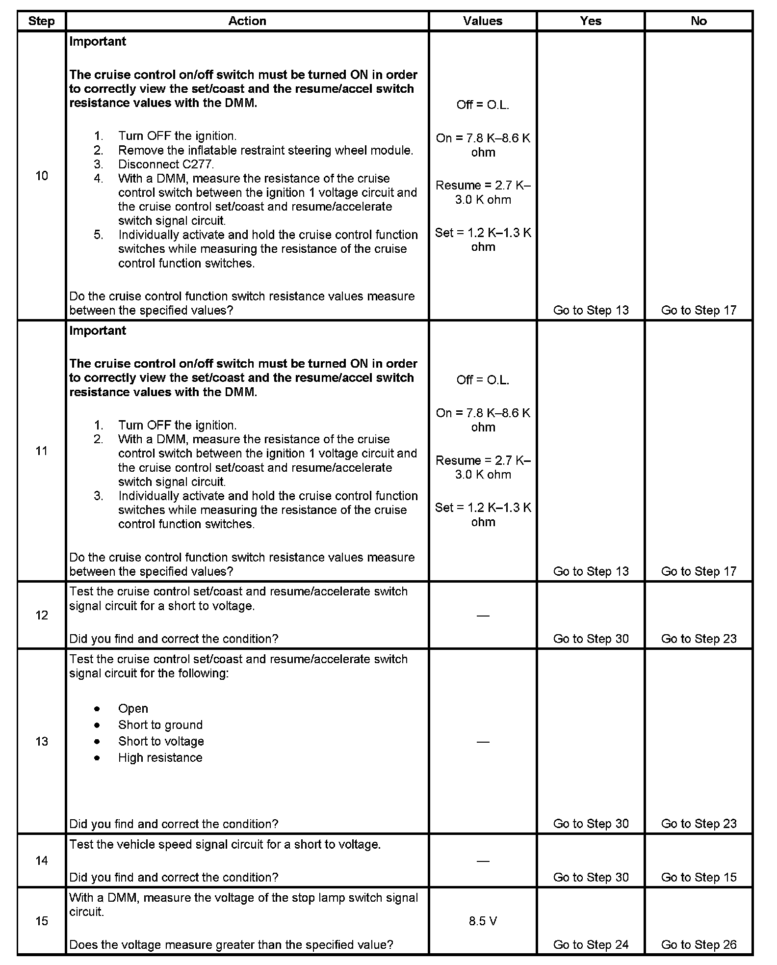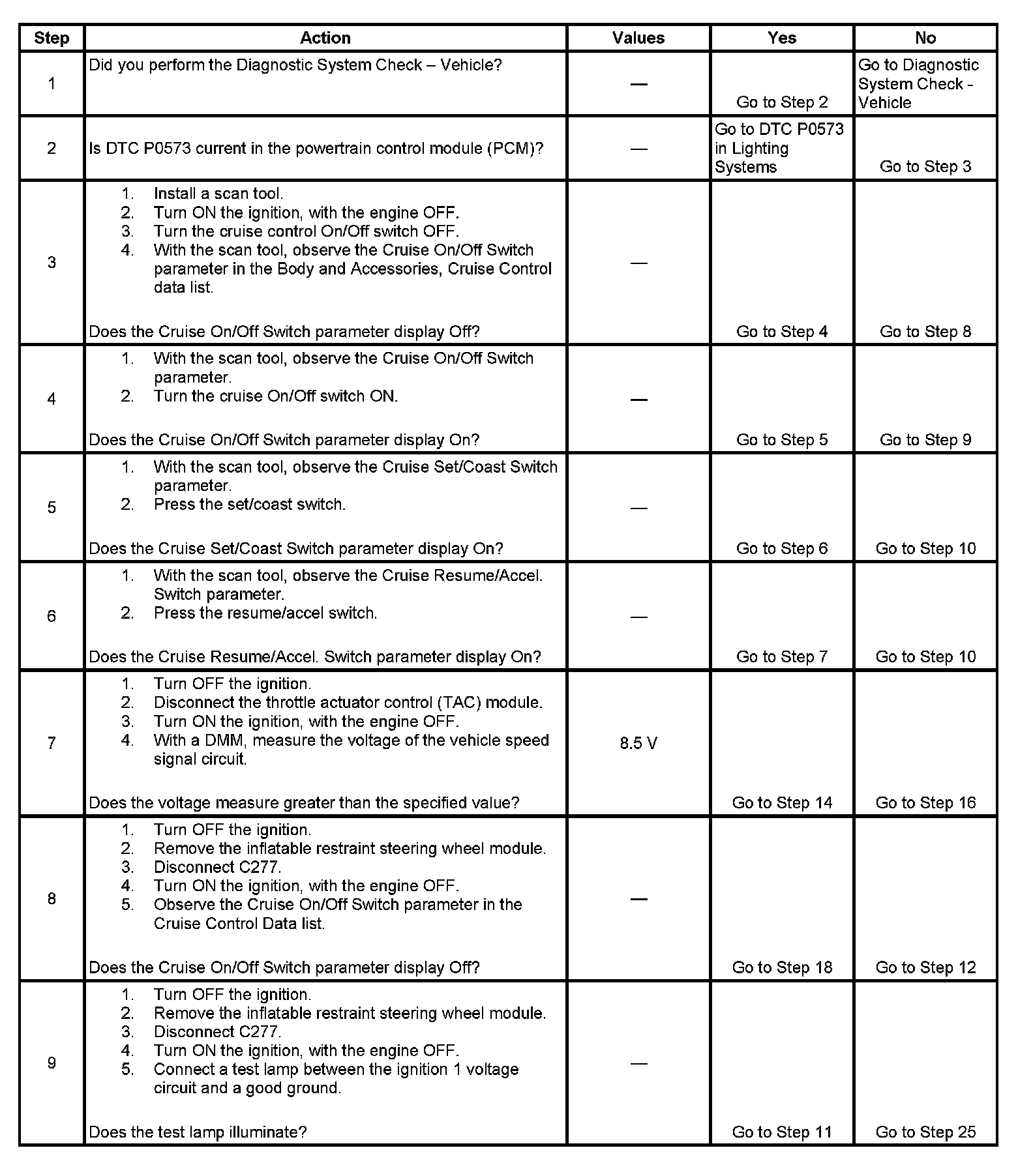 - With a scan tool, observe the cruise control function switch parameters, in the Body and Accessories, Cruise Control data list, while rotating the steering wheel to both steering stops and individually activating each cruise control function switch separately. This will help eliminate the possibility of an internally shorted inflatable restraint steering wheel module coil.