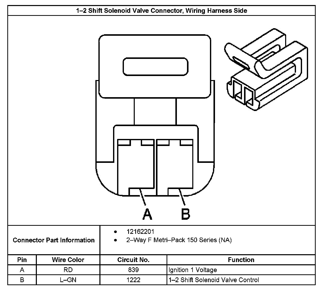 1-2 Shift Solenoid Valve Connector End View, Wiring Harness Side:
