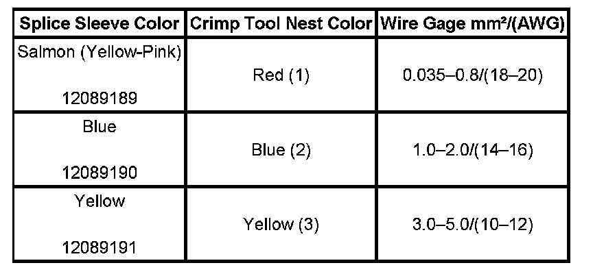 4. Select the proper duraseal splice sleeve according to the wire size. Refer to the above table at the beginning of the repair procedure for the color coding of the duraseal splice sleeves and the crimp tool nests.