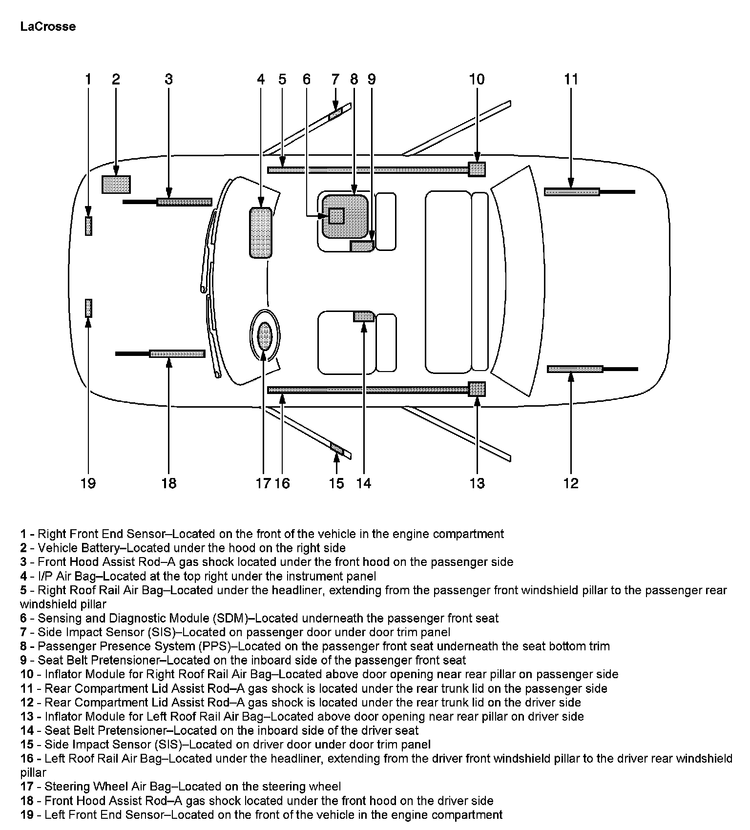 The SIR Zone Identification Views shown illustrate the approximate location of all SIR components available for the vehicle. This will assist in determining the appropriate SIR Disabling and Enabling Zones for a given service procedure, refer to SIR Disabling and Enabling Zones.