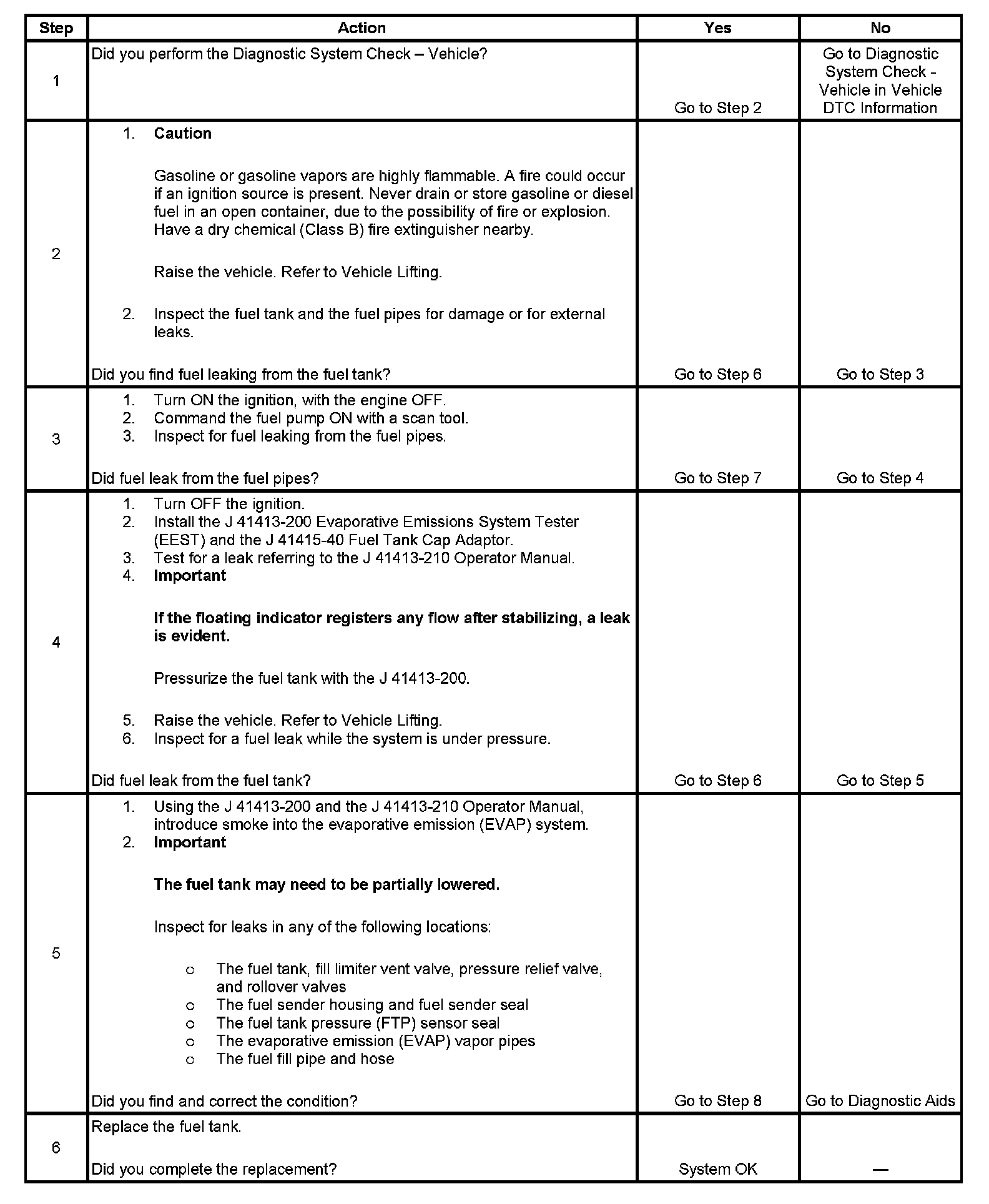 The fuel tank leak test is used to locate any fuel or fuel vapor escaping the fuel tank area. Fuel vapors escaping above the fuel level will be detected when the evaporative emission (EVAP) diagnostics complete one test cycle. The malfunction indicator lamp (MIL) will illuminate after the EVAP diagnostics complete 2 test cycles.