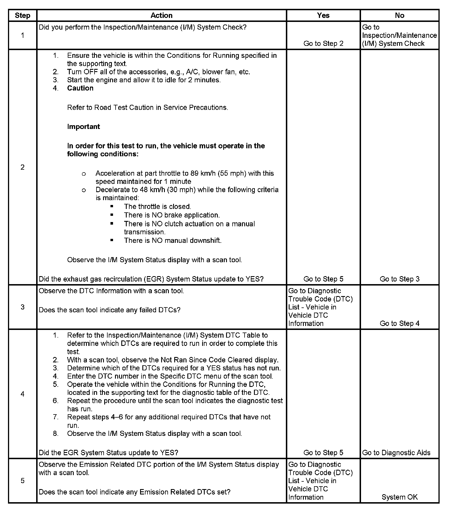 The control module only runs the EGR Active Tests during a gradual deceleration with a closed throttle and a vehicle speed above 48 km/h (30 mph). Several deceleration cycles may be necessary in order to accumulate a sufficient number of EGR flow samples. The procedure outlined in the table is for a clear, flat road. If the procedure is performed on a road with a slight down hill grade, the test may acquire the necessary sample counters in one or two decel trips. If the test is interrupted during the procedure, it may take more than 3 deceleration cycles to complete the test. If the status does not update, the test outlined in this procedure can be repeated until the I/M System Status updates to YES.