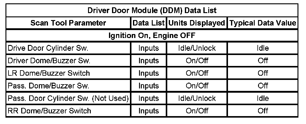 Driver Door Module (DDM) Data List: