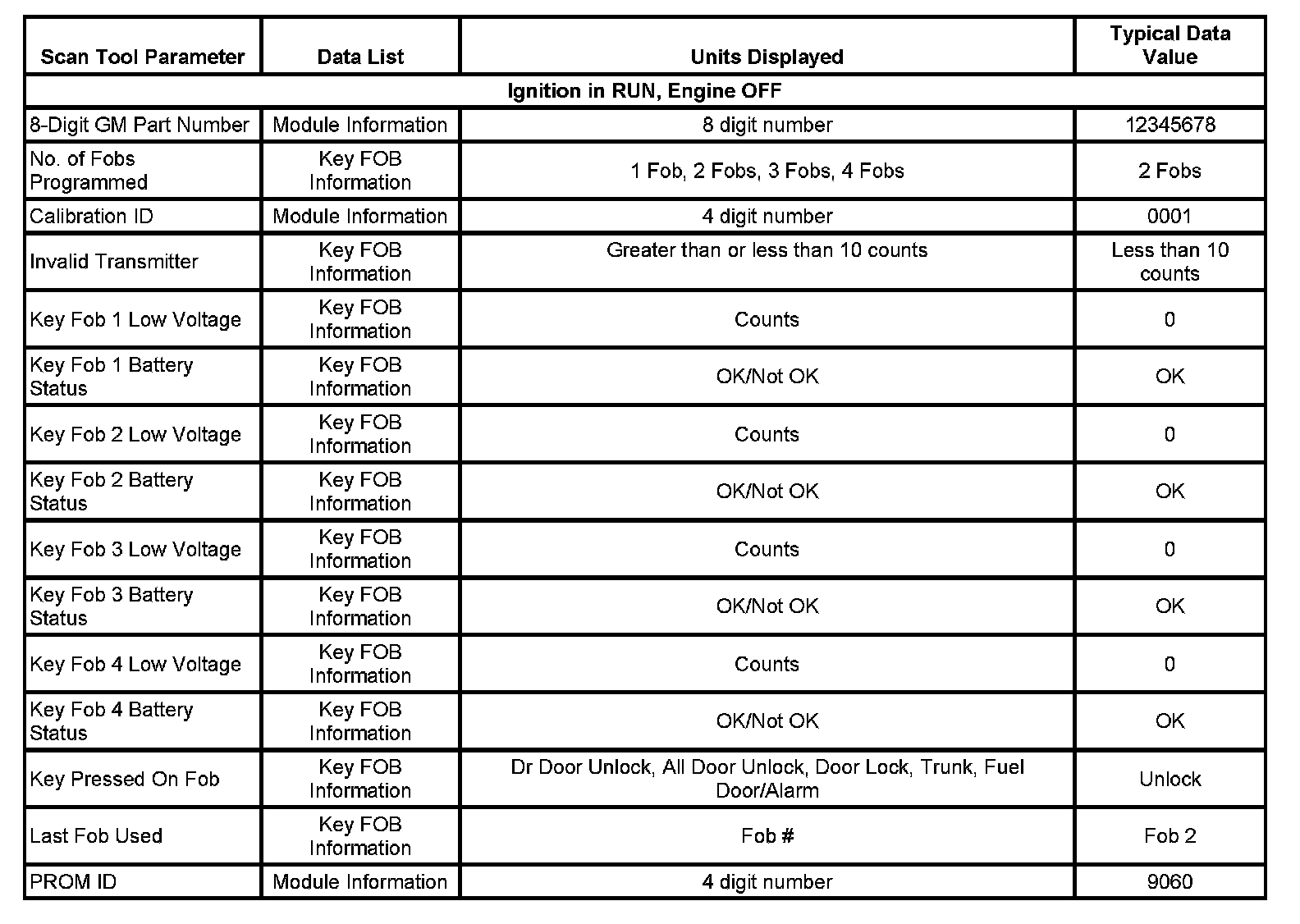 The Keyless Entry Scan Tool Data List contains all of the keyless entry related parameters that are available on the scan tool. The parameters in the list are arranged in alphabetical order. The column, Data List, indicates the location of the parameter within the scan tool menu selections. Use the Keyless Entry Scan Tool Data List as directed by a diagnostic table or in order to supplement the diagnostic procedures. Begin all of the diagnostic procedures with Diagnostic System Check - Vehicle in Vehicle DTC Information.