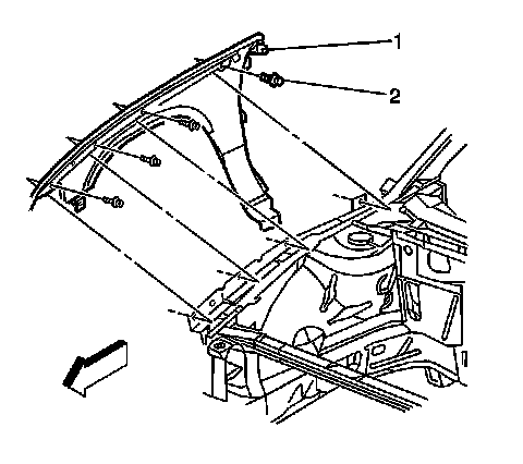 9. Remove the bolts (2) retaining the bottom of the fender (1) at the door hinge pillar.