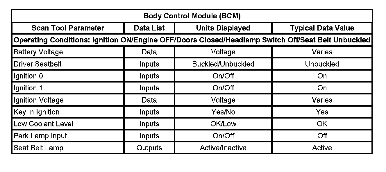 Scan Tool Data List - Body Control Module (BCM)
