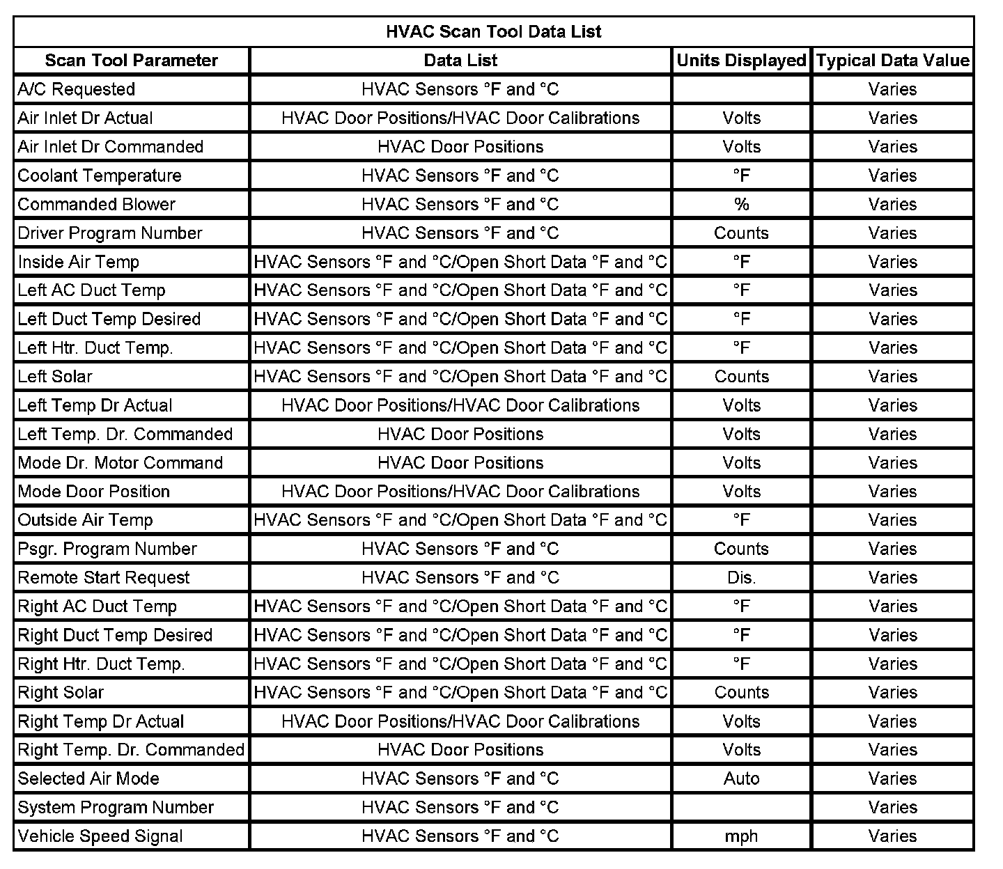 HVAC Scan Tool Data List: