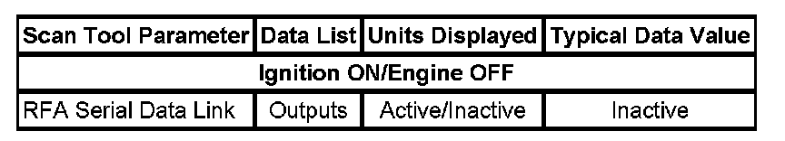 The Keyless Entry Scan Tool Data List contains all of the keyless entry related parameters that are available on the scan tool. The parameters in the list are arranged in alphabetical order. The column, "Data List," indicates the location of the parameter within the scan tool menu selections. Use the Keyless Entry Scan Tool Data List as directed by a diagnostic table or in order to supplement the diagnostic procedures. Begin all of the diagnostic procedures with Diagnostic System Check - Vehicle. Testing and Inspection