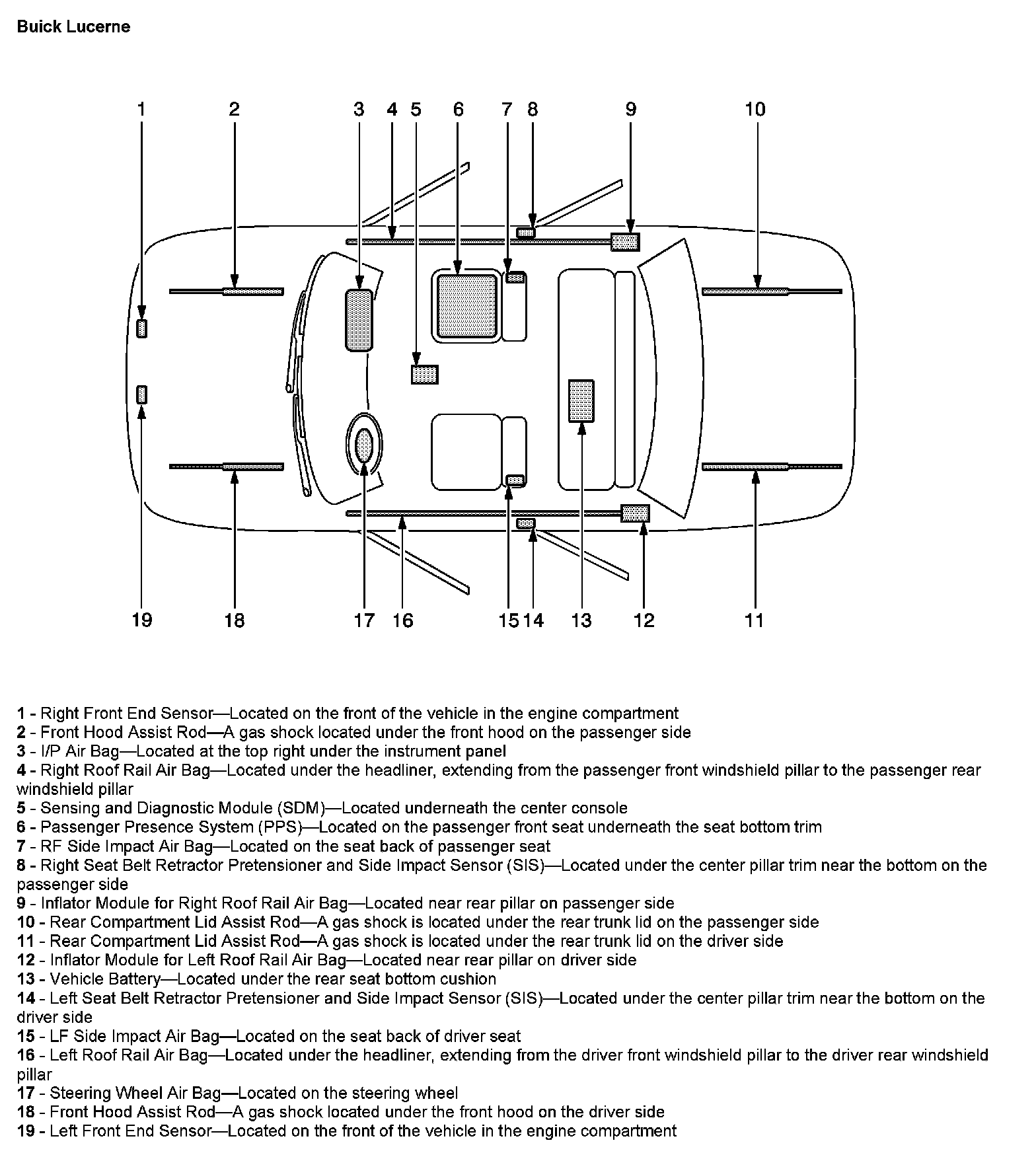 The SIR Zone Identification Views illustrate the approximate location of all SIR components available for the vehicle. This will assist in determining the appropriate SIR Disabling and Enabling Zones for a given service procedure, refer to SIR Disabling and Enabling Zones.