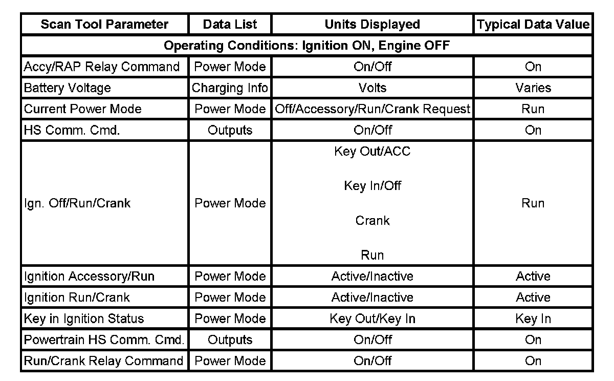 The scan tool data values were taken from a known good vehicle under the following conditions: