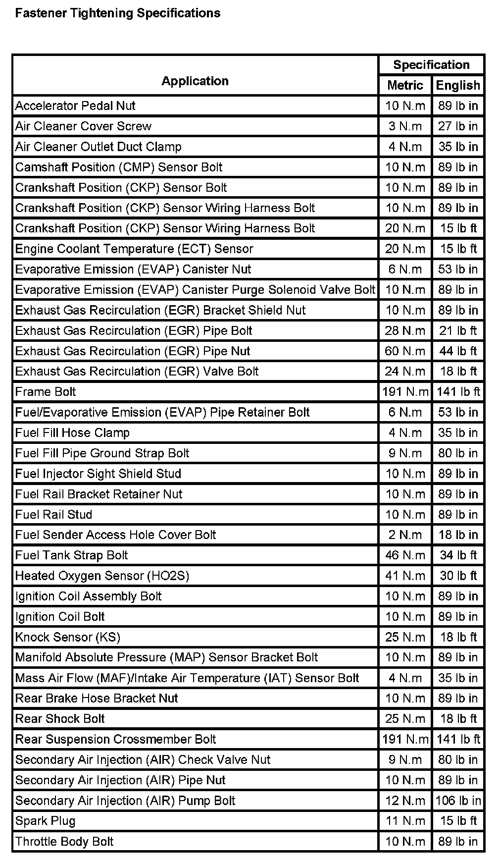 Fastener Tightening Specifications: