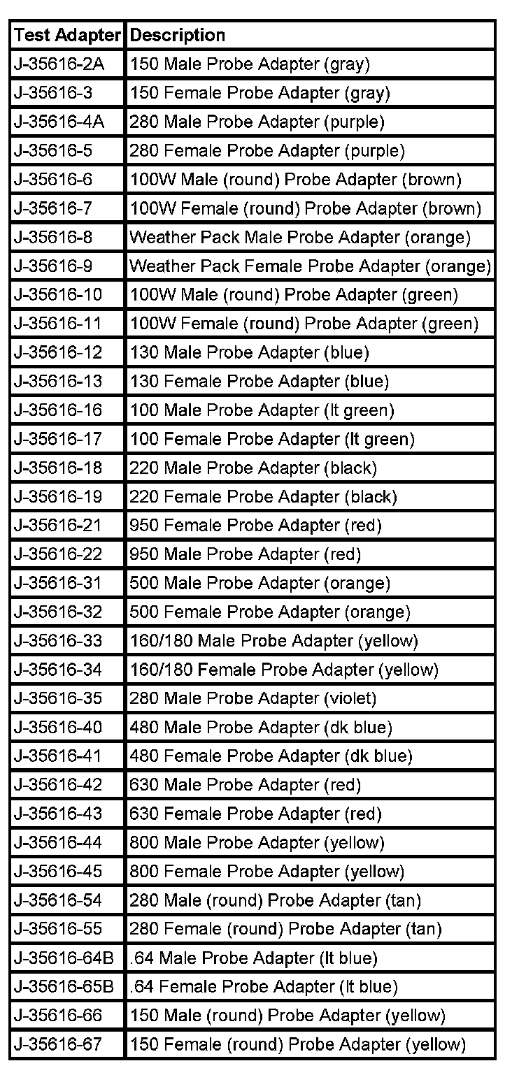 NOTE: Do not insert test equipment probes (DVOM etc.) into any connector or fuse block terminal. The diameter of the test probes will deform most terminals. A deformed terminal will cause a poor connection, which will result in a system failure. Always use the J-35616 GM-Approved Terminal Test Kit or the J 42675 Flat-Wire Probe Adapter in order to front probe terminals. Do not use paper clips or other substitutes to probe terminals.