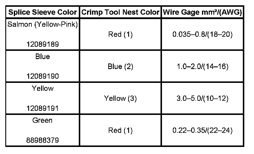4. Select the proper DuraSeal splice sleeve according to the wire size. Refer to the above table at the beginning of the repair procedure for the color coding of the DuraSeal splice sleeves and the crimp tool nests.