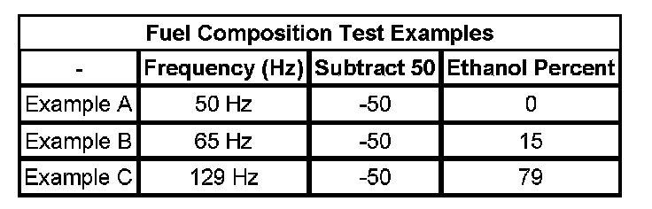 3. Subtract 50 from the reading on the DMM in order to obtain the percentage of alcohol in the fuel sample. Refer to the examples in the Fuel Composition Test Examples table.