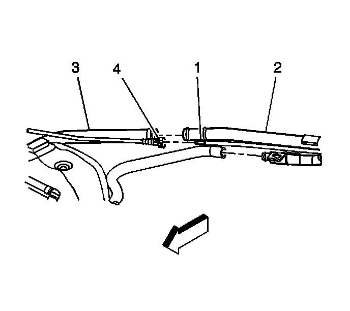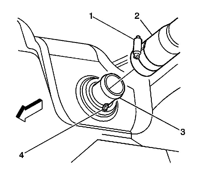 7. Disconnect the EVAP vent pipe quick connect fitting (4) from the fill pipe EVAP vent pipe quick connect fitting (1).