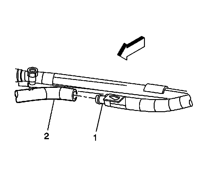 6. Disconnect the EVAP vent solenoid hose (2) on the tank from the EVAP vent valve solenoid hose (1).
