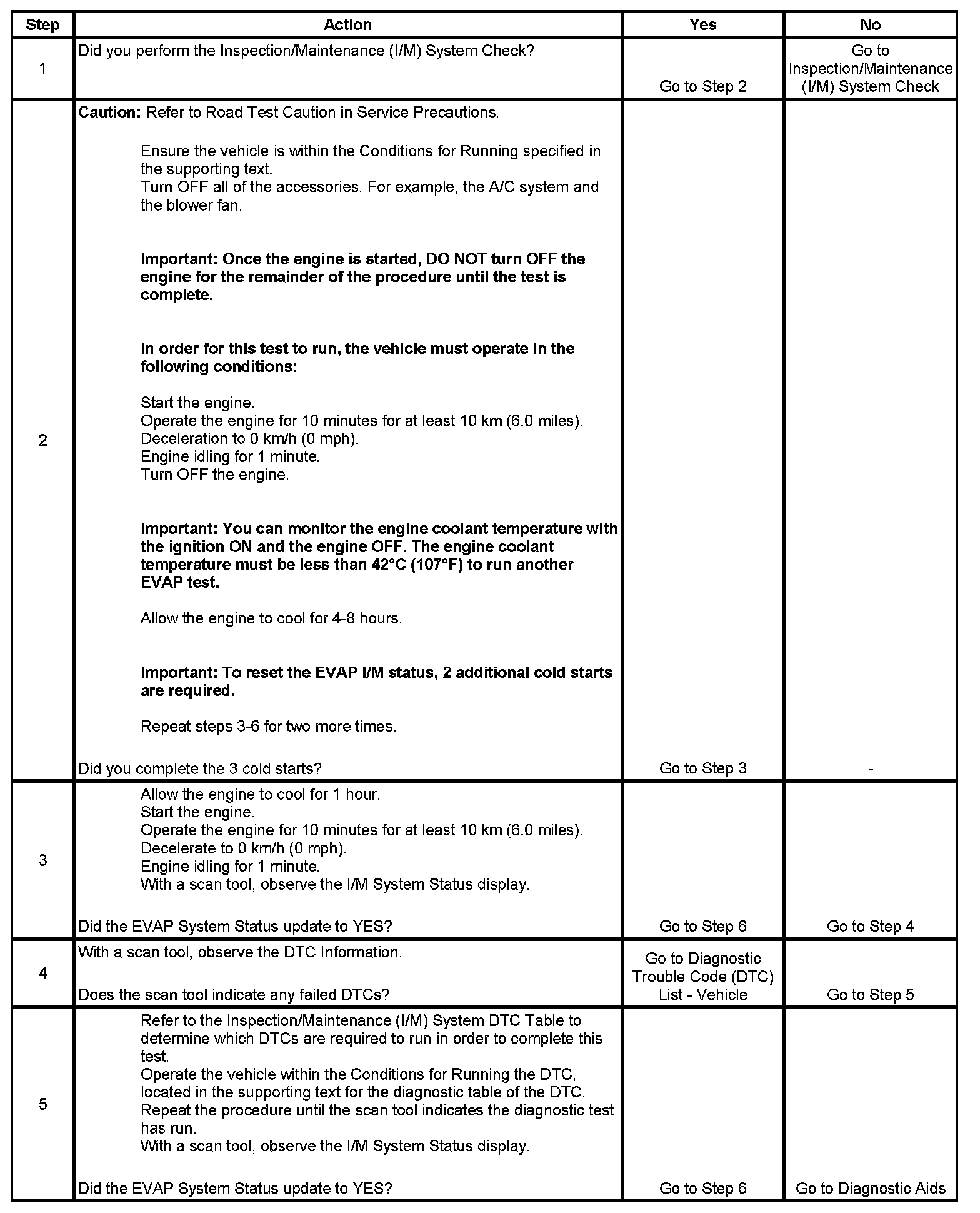 * The first failure of a type B DTC does not constitute a final determination of pass or fail, and will not update the I/M System Status to YES. A second and third trip is required, and all the conditions to run must be met in order for the test to run again. These conditions require a complete engine cool down before the EVAP I/M ready status changes to YES.