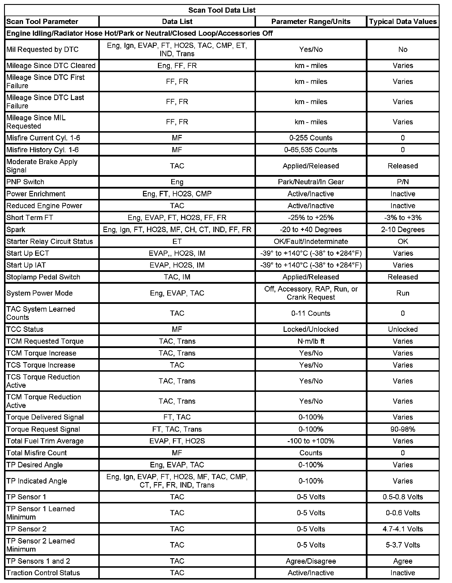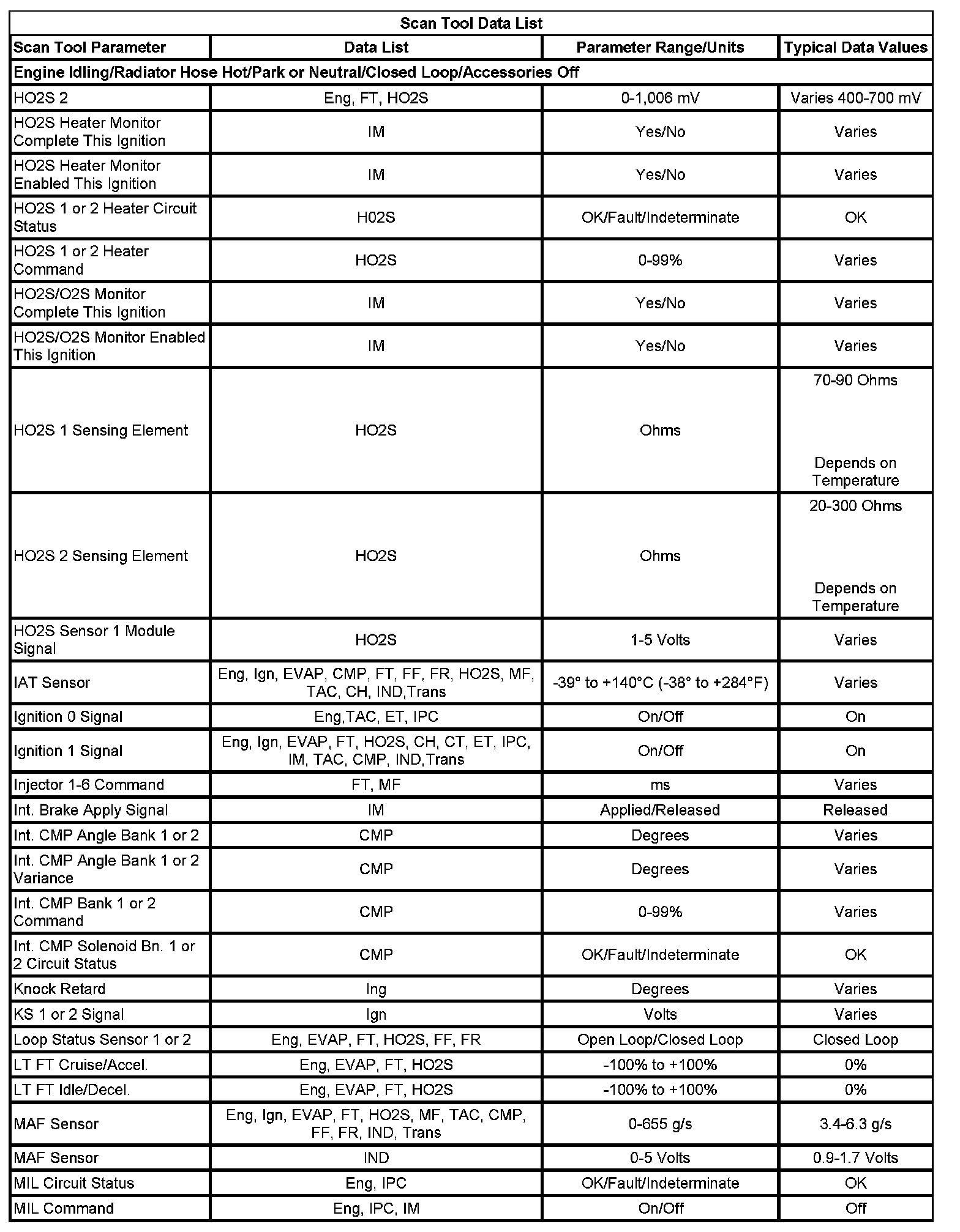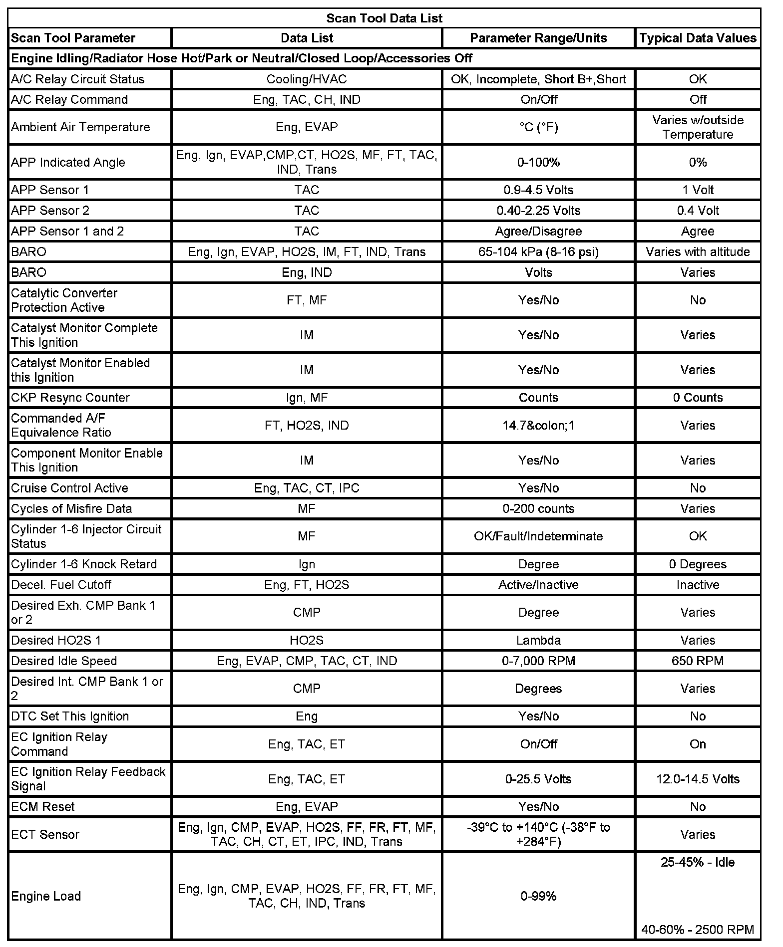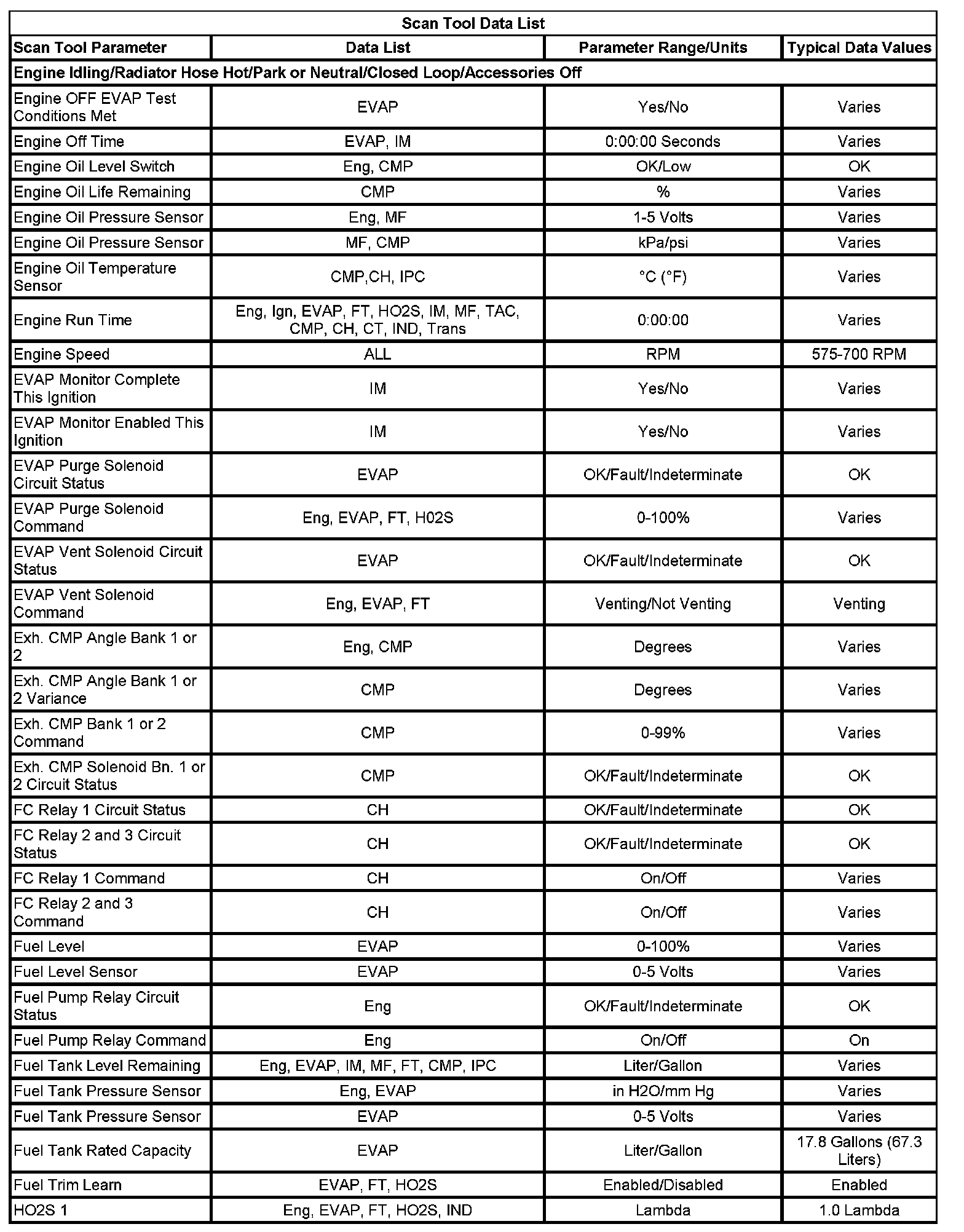 The Engine Scan Tool Data List contains all engine related parameters that are available on the scan tool. The list is arranged in alphabetical order. A parameter may appear in any one of the data lists, and in some cases may appear more than once, or in more than one data list in order to group certain related parameters together.