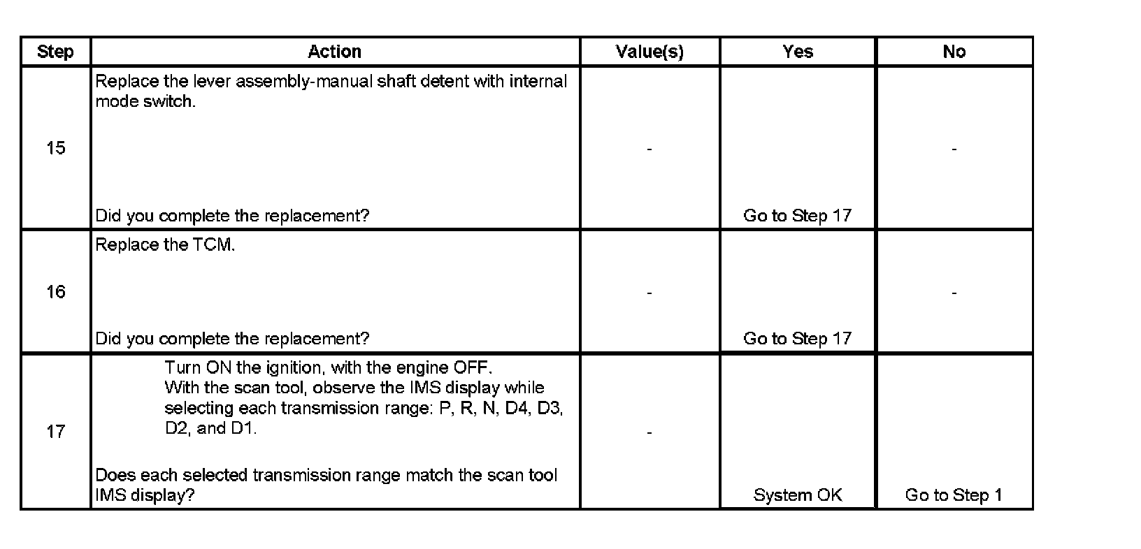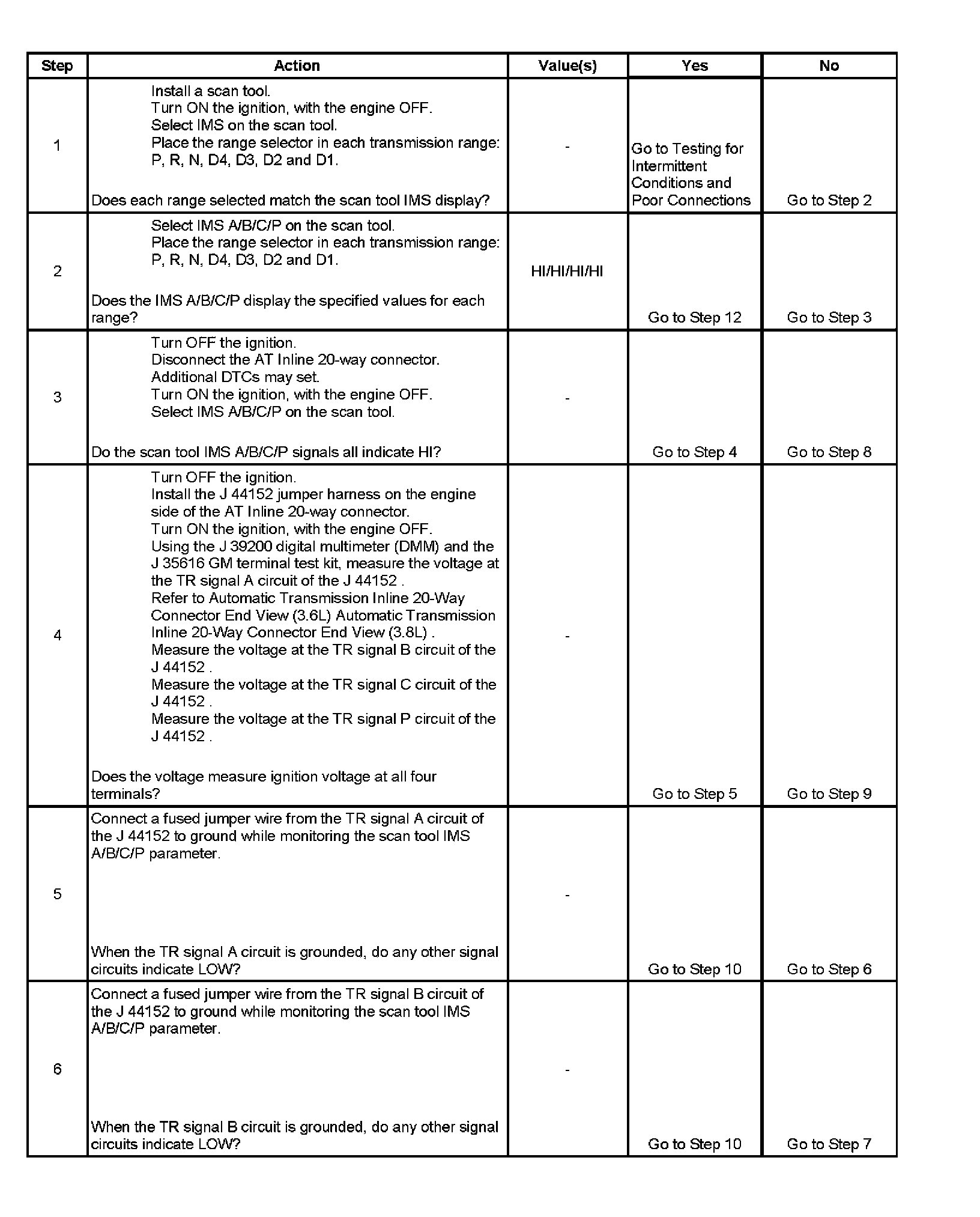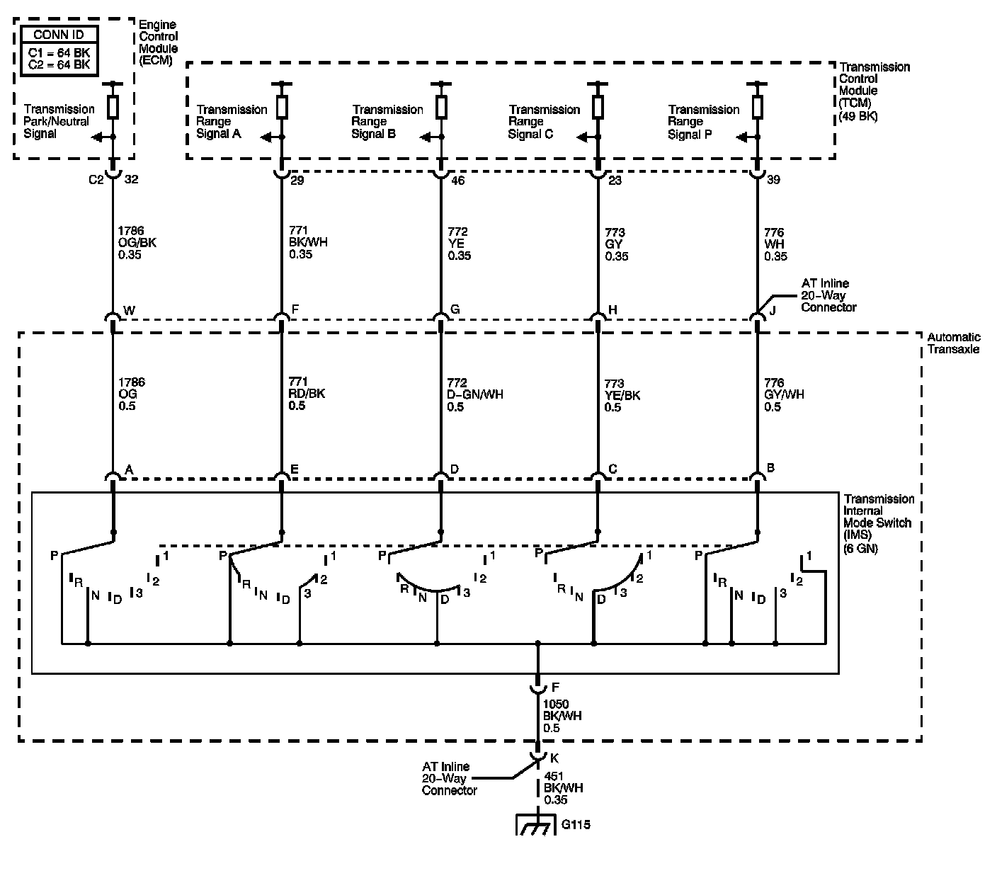 The transmission internal mode switch (IMS) is a sliding contact switch attached to the selector detent inside the transmission side cover. The 4 inputs to the transmission control module (TCM) indicate the position of the transmission range selector. The input voltage level at the TCM is high, B+, when the IMS is open and low when the switch is closed to ground. The 4 input parameters represented are Signals A, B, C and P, Parity. Refer to Transmission Internal Mode Switch Logic.