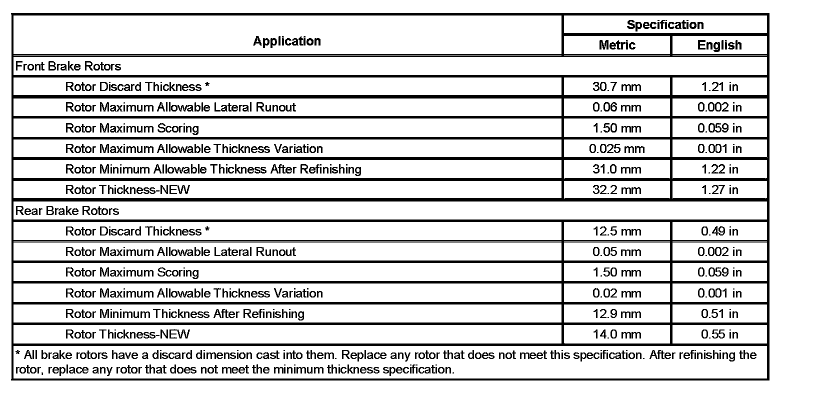 Disc Brake Component Specifications: