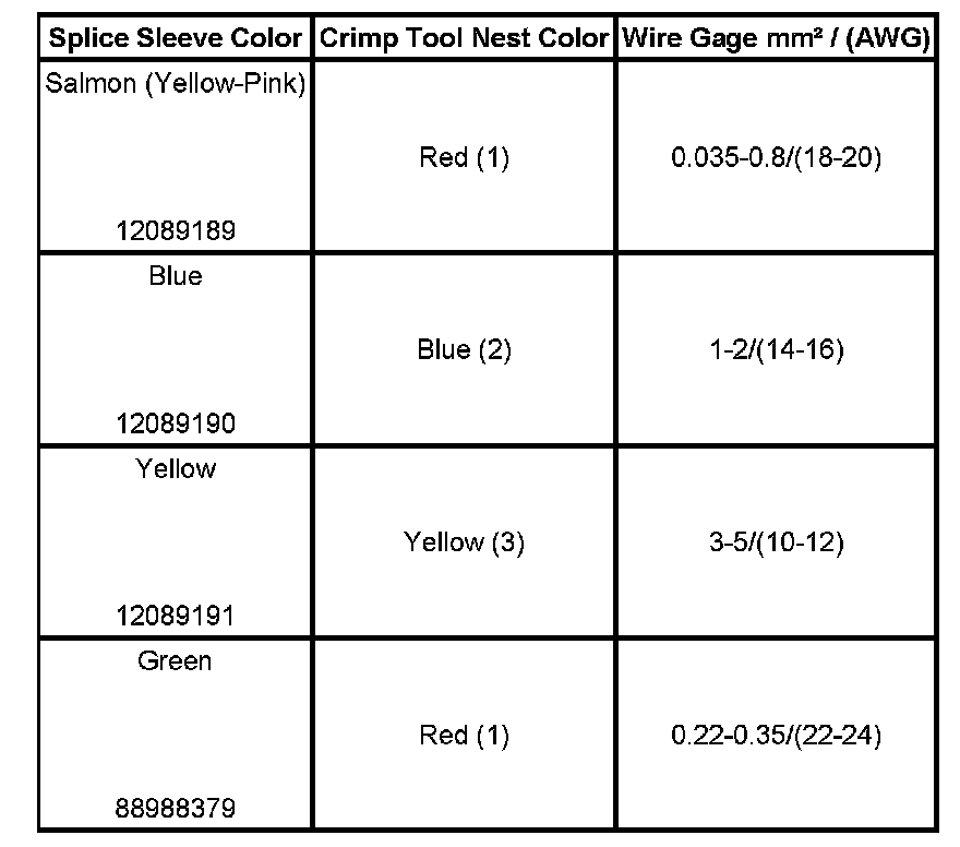 4. Select the proper DuraSeal splice sleeve according to the wire size. Refer to the above table at the beginning of the repair procedure for the color coding of the DuraSeal splice sleeves and the crimp tool nests.