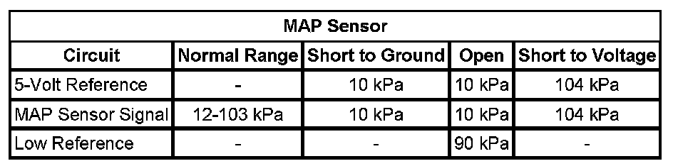 ^ If the MAP sensor is less than 103 kPa, then test the MAP sensor signal circuit for a short to ground, an open, high resistance. If the circuit tests normal, replace the control module.