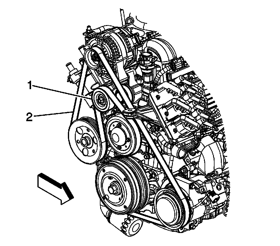 1. Using a 15 mm box end wrench on the pulley nut, rotate the drive belt tensioner (1) counterclockwise.