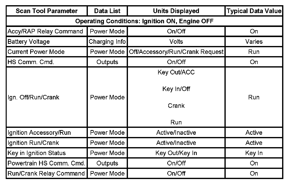The scan tool data values were taken from a known good vehicle under the following conditions: