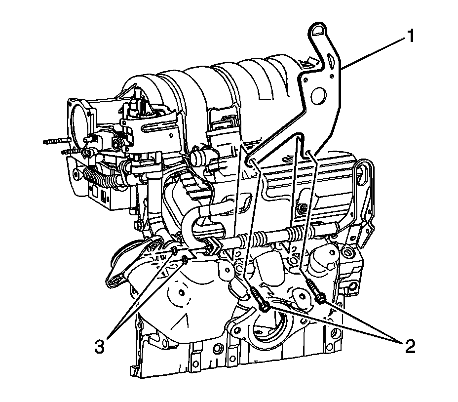 5. Remove the intake manifold cover bracket bolts (2) and bracket (1).
