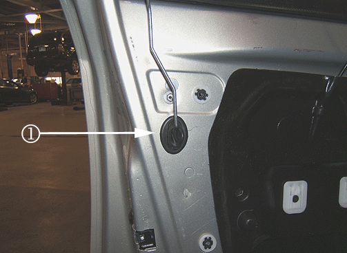 2. Locate the lock rod grommet in the door inner panel (1). Remove the original type grommet and install the revised grommet (2).