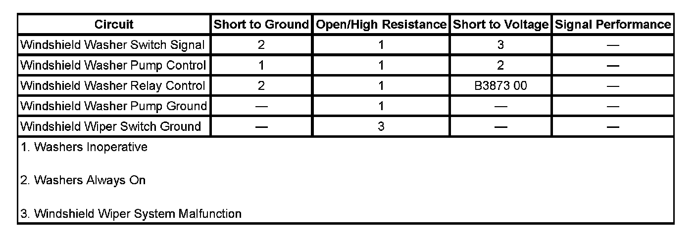 - If the washer pump does not turn OFF, test the washer pump control circuit for a short to voltage.