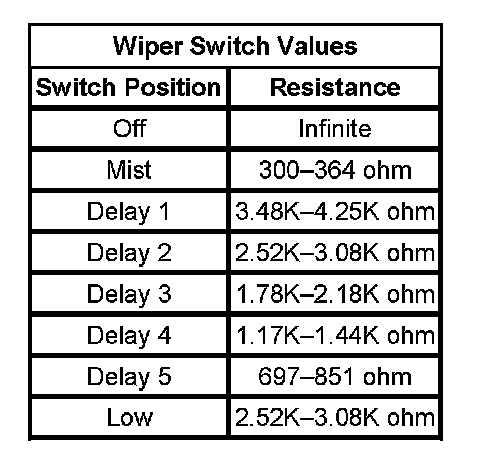 2. Test the resistance between terminals H and L. Rotate the wiper switch and compare the resistance readings to the values in the Windshield Wiper Switch Values table below for MIST, each DELAY and LOW speed.