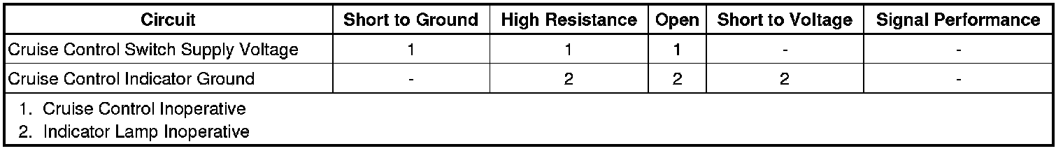 This diagnostic assumes the cruise control system is operating properly and no DTCs are set. If the cruise control system is malfunctioning, refer to Cruise Control Malfunction (Cruise Control Malfunction).