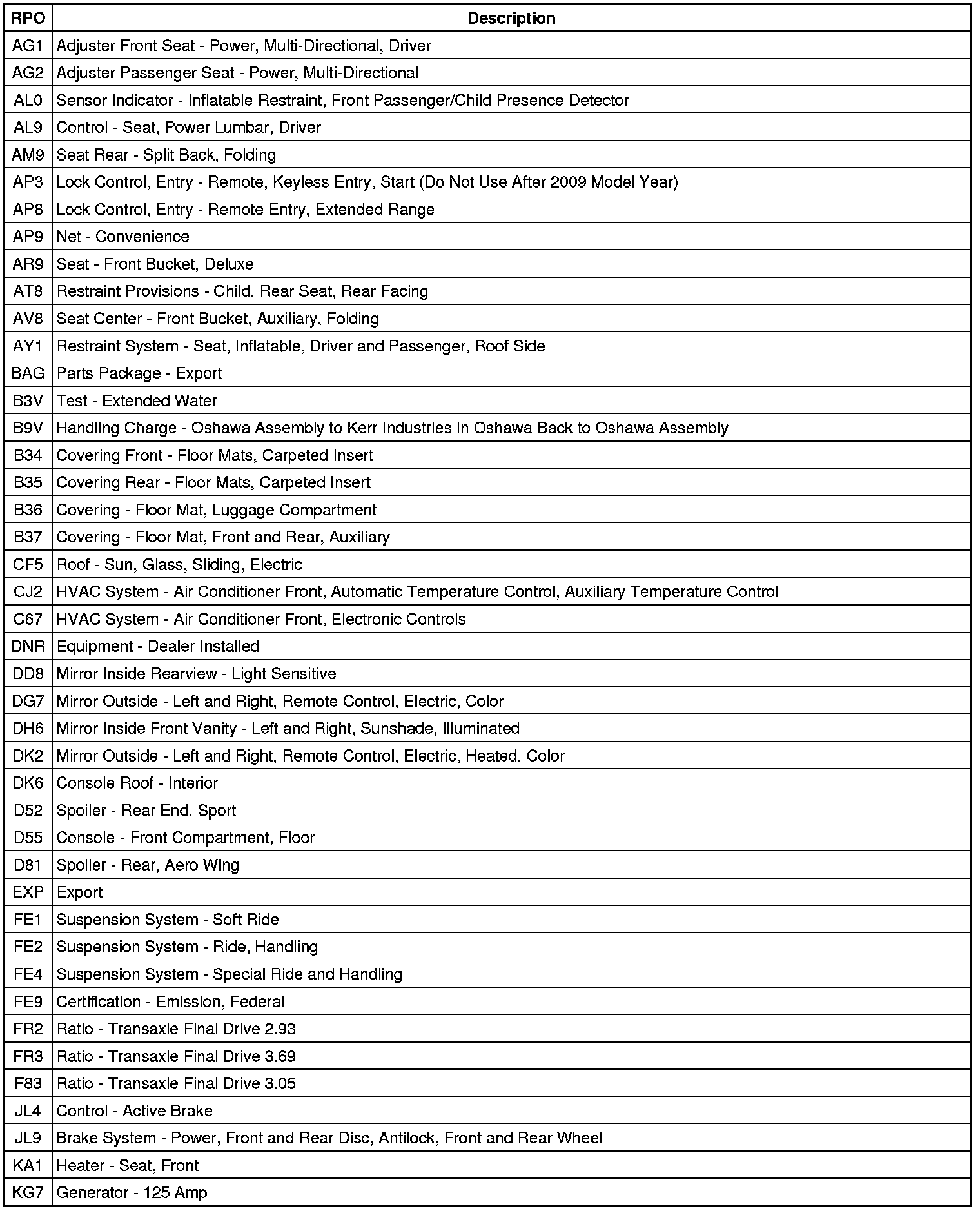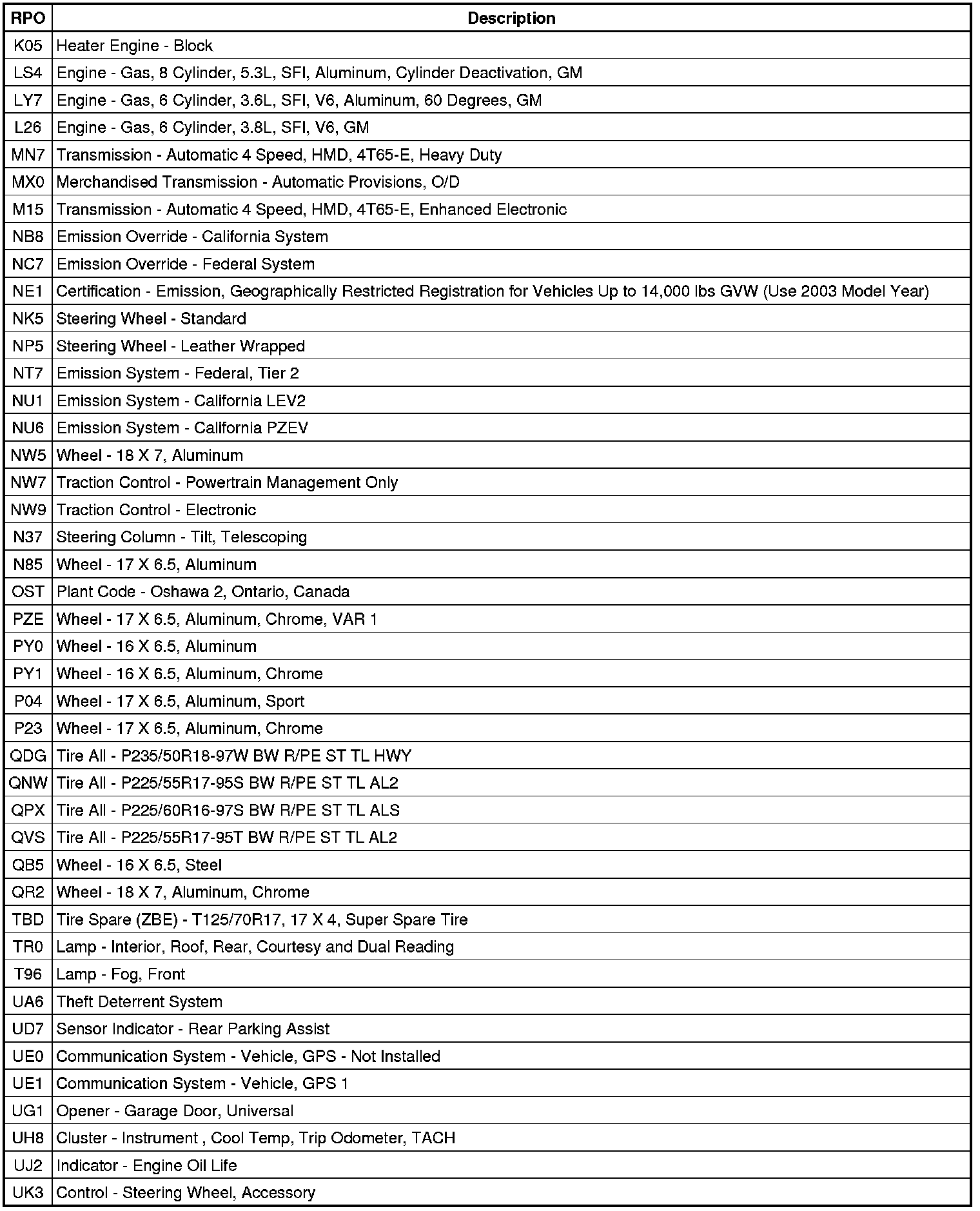 RPO Code List