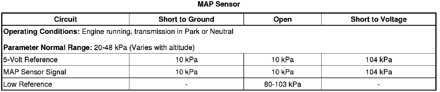 • If the MAP sensor is less than 103 kPa, then test the MAP sensor signal circuit for a short to ground, an open, high resistance. If the circuit tests normal, replace the control module.