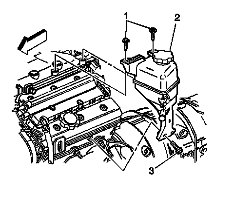 3. Remove the remote power steering fluid reservoir mounting bolts (1, 3) ONLY, and position aside.