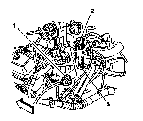 8. Connect the heated oxygen sensor connector (2) to the rear of the throttle body heater inlet hose/pipe (3).