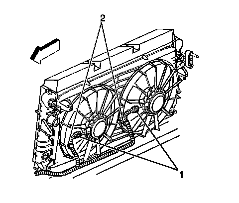 13. Remove the clips (2) attaching the harness to the fan shroud.