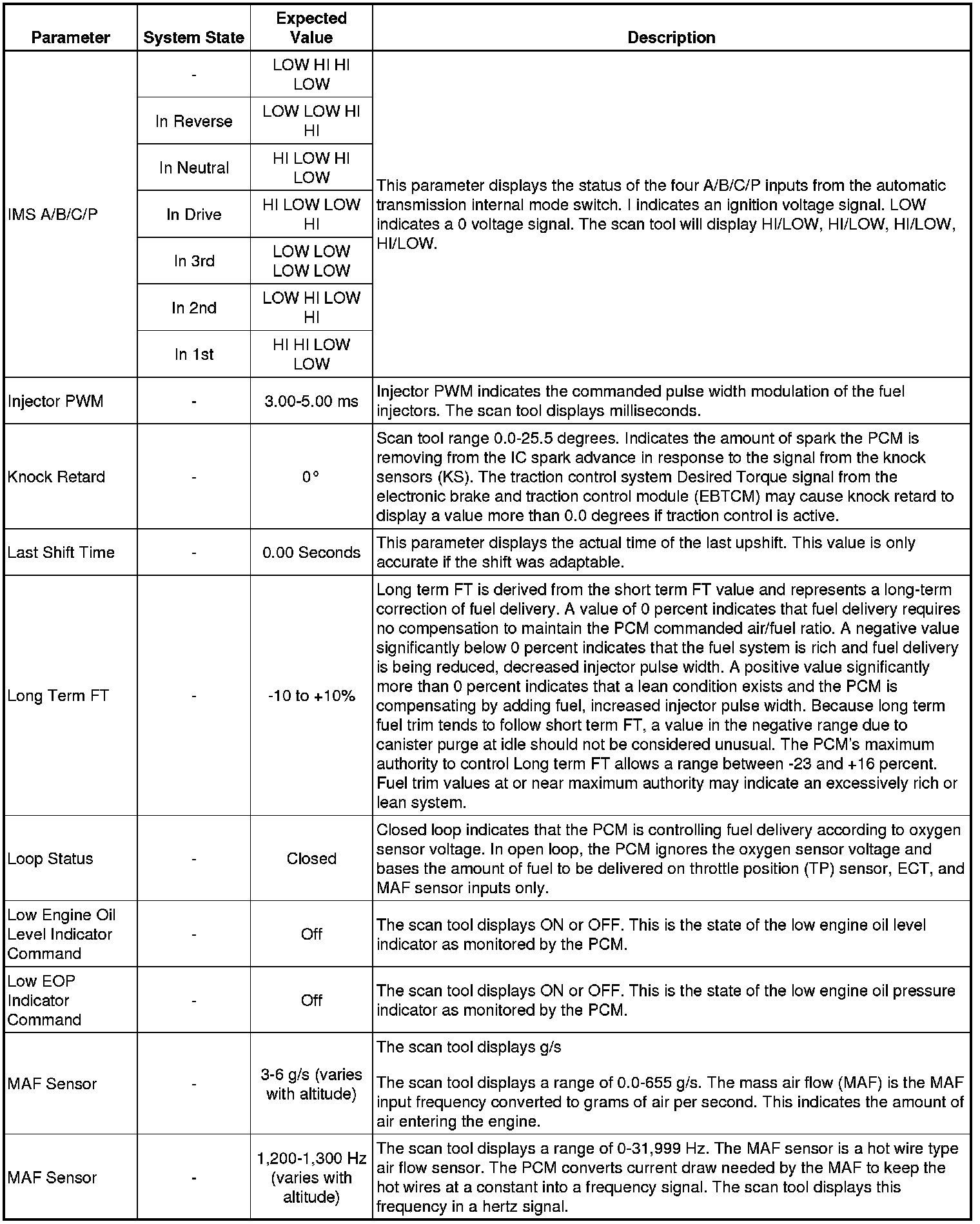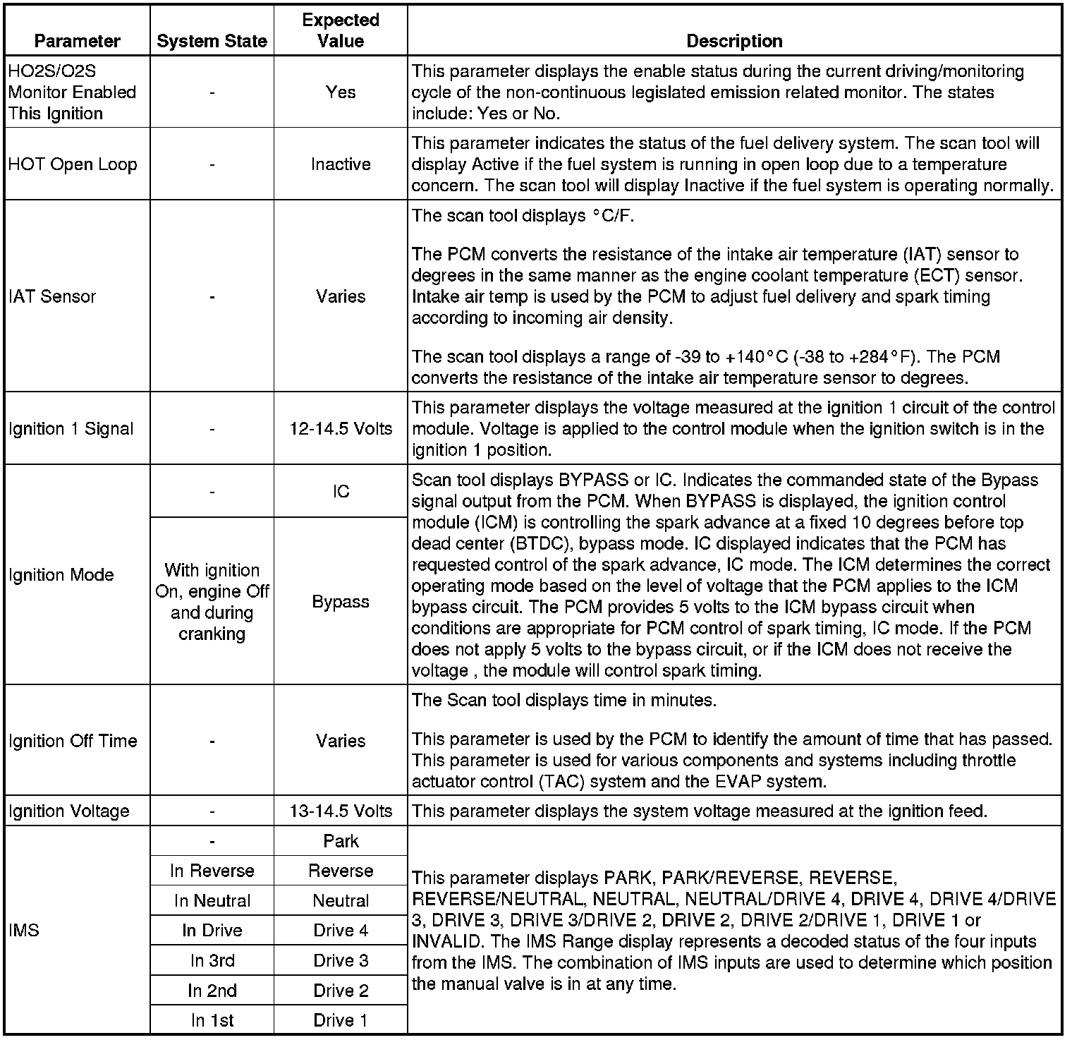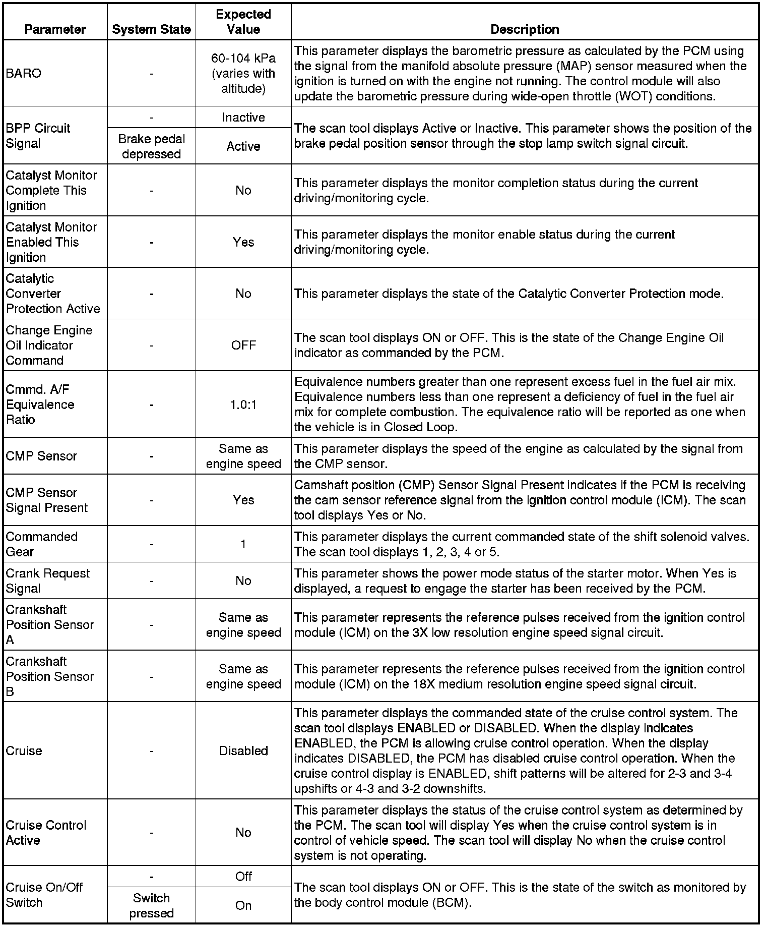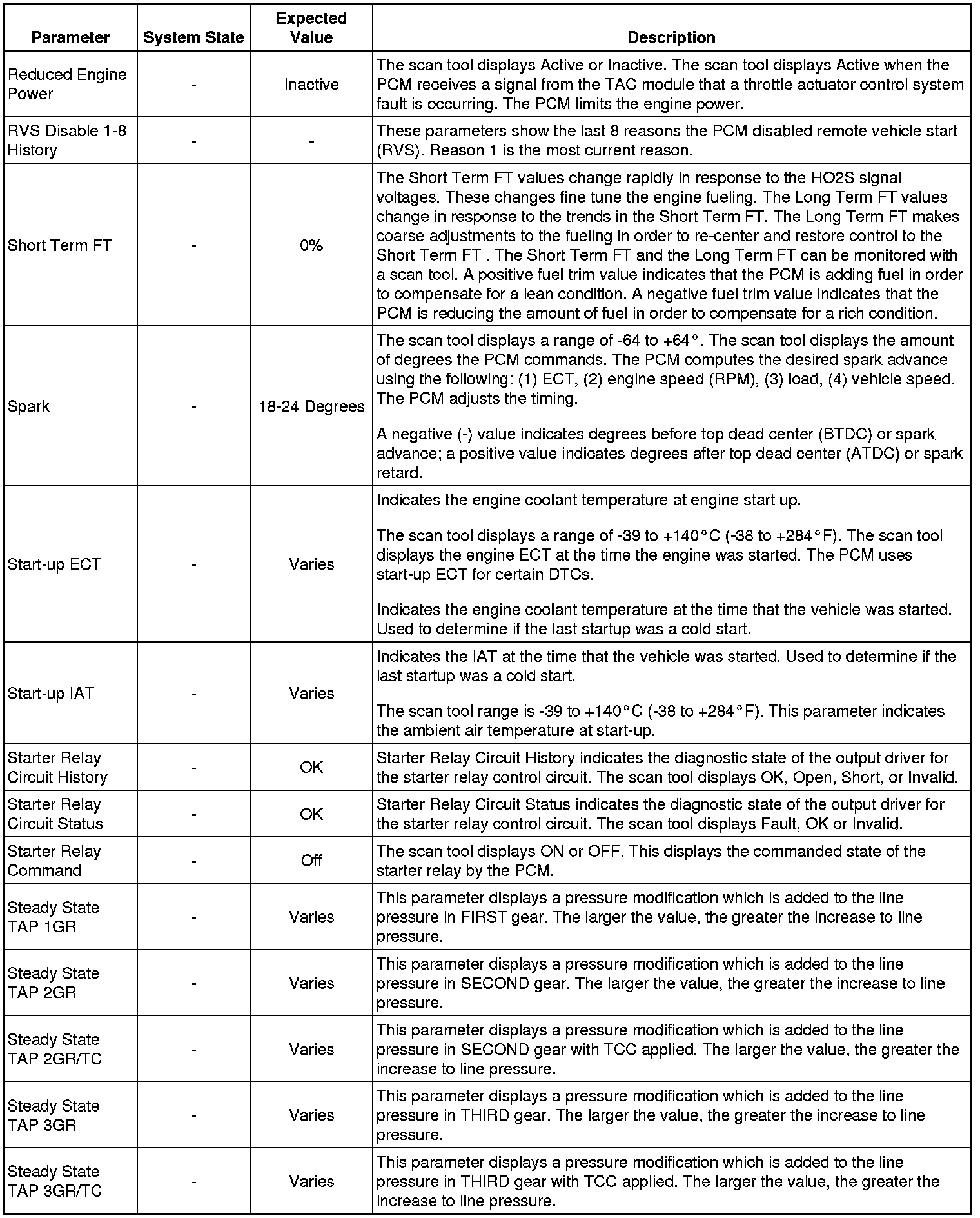 Only the parameters listed below are referenced in this service manual for use in diagnosis. If all values are within the typical range described below, Refer to for diagnosis.
