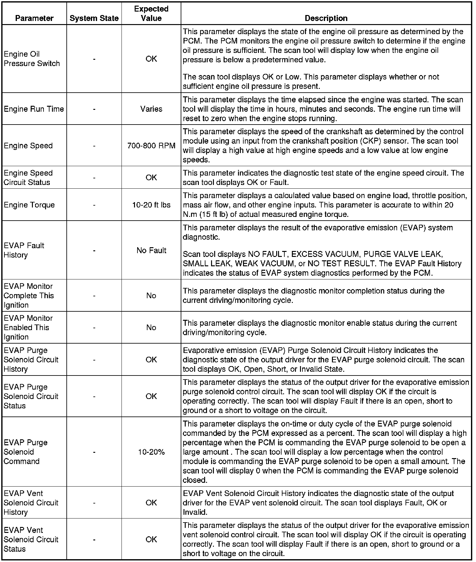The scan tool values from a properly running engine may be used for comparison with the engine you are diagnosing. The Engine Scan Tool Data List represents values that would be seen on a normally running engine.