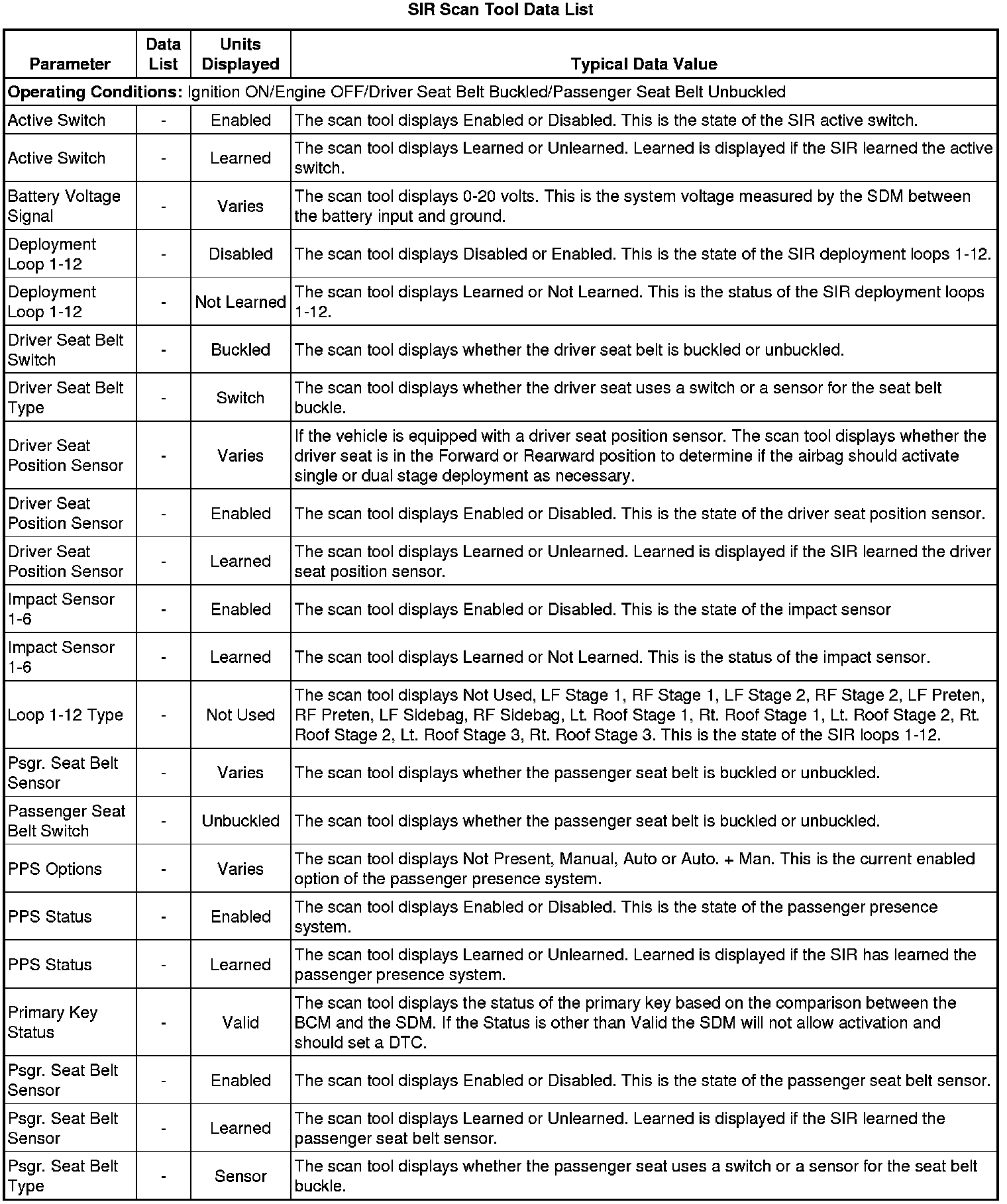 The SIR scan tool data list and PPS scan tool data list contain the restraint system related parameters that are available on the scan tool. The column, Data List, indicates the location of the parameter within the scan tool menu selections.