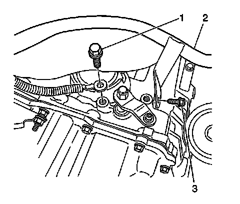 9. Remove the wiring harness (3) from the wiring harness retainer (1) on the transaxle.