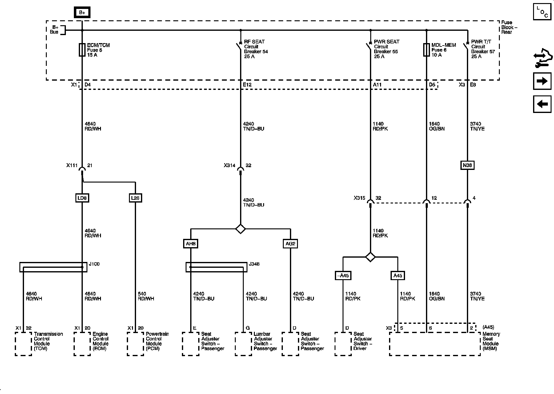 Rear Fuse Block - MSM/RT FRT PWR SEAT, MSM/LT FRT PWR SEAT, MSM Circuit Breakers, ECM/TCM, MSM LOGIC/RF MASSAGE Fuses