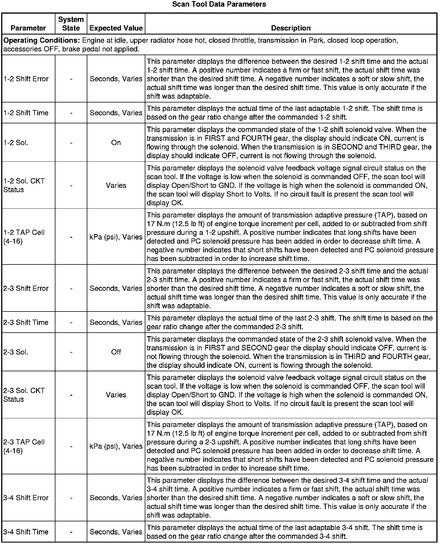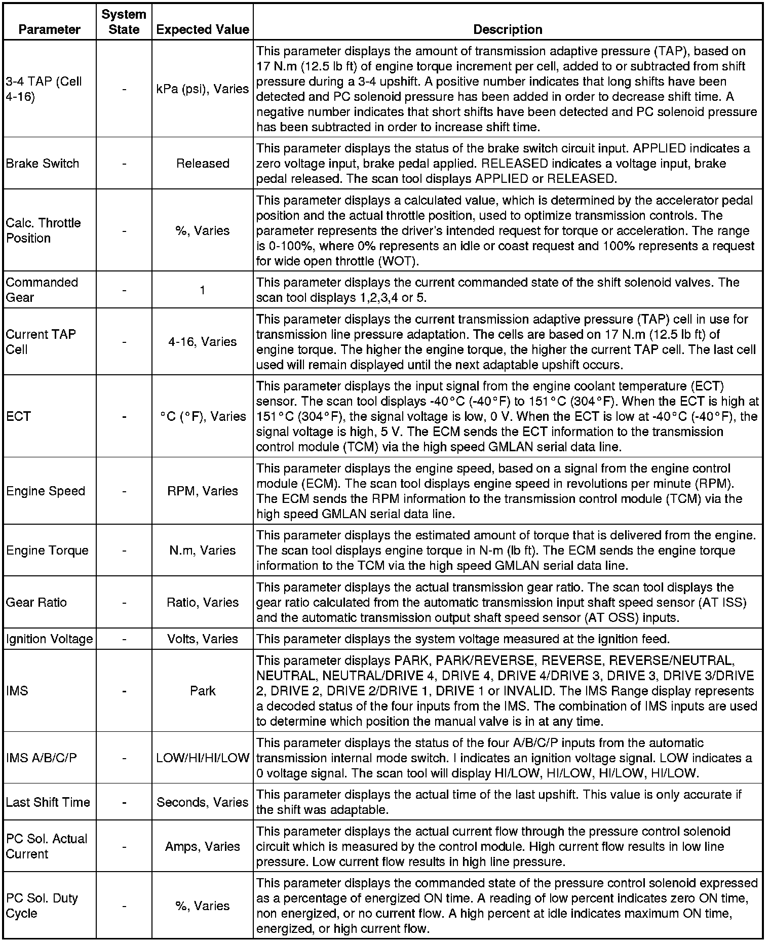 The Transmission Control Module Scan Tool Data List contains all transmission related parameters that are available on the scan tool. The list is arranged in alphabetical order. A given parameter may appear in any one of the data lists, and in some cases may appear more than once, or in more than one data list in order to group certain related parameters together.