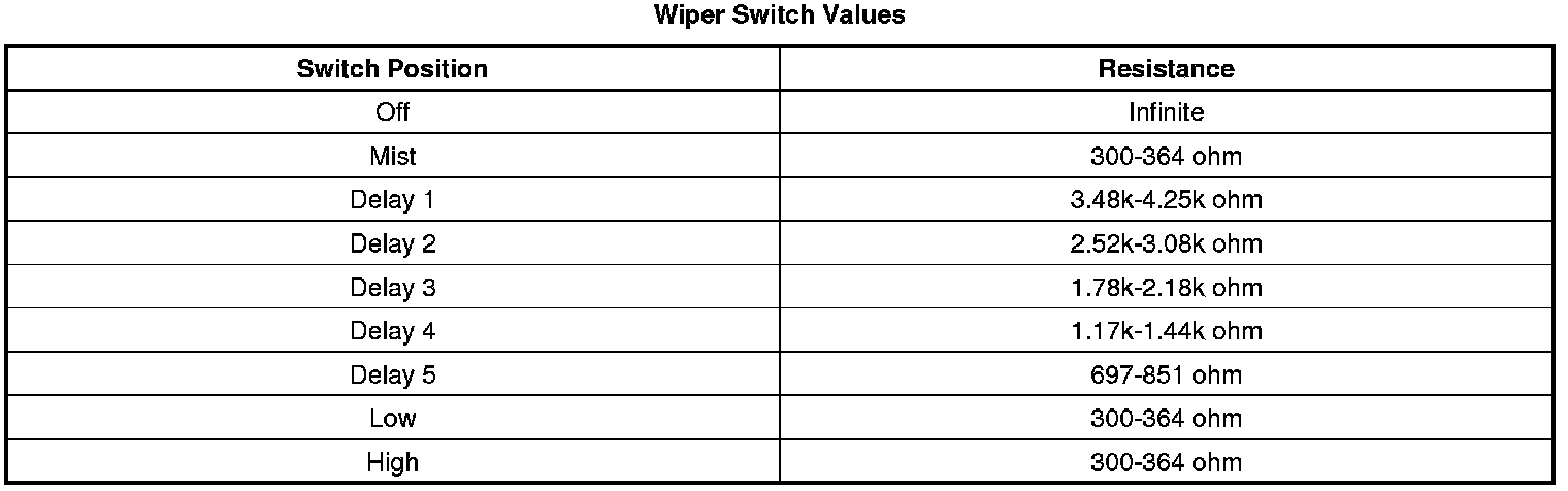 3. While cycling the wiper switch through each delay and speed position, test for the specified resistance between the low reference terminal M and the signal terminal N.